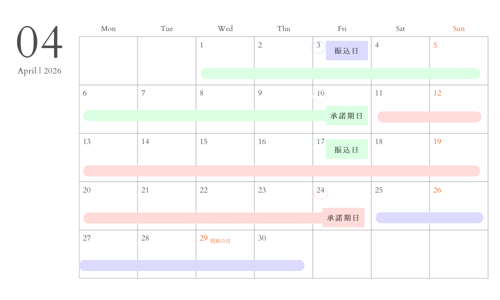 ・3月14日(土)〜3月27日(金)までにご承諾いただいた場合は4月3日(金)にお振込いたします。